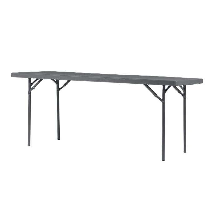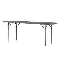 Table pliante de couleur grise foncée bleutée avec un plateau en polyéthylène de haute densité 100% pur. Dimensions: 182.9 x 75.2x H74.3 cm Capacité pour 6 personnes assises. Ergonomique, confort total aussi pour les personnes situées en bout de table. Nouveau mécanisme de blocage manuel au maniement très doux et anneaux autoglissants de sécurité inclus. Embouts des pieds intégrés. Système d'assemblage transversal et longitudinal. Chariot XLTrolley disponible avec capacité pour 20 tables. , Léger et résistant en cas de choc Stable et apte à supporter des charges lourdes Durable, compétitif et nécessitant peu d’entretien Rapide et sûr pour être monté et démonté fréquemment Facile à transporter et à stocker en économisant de l’espace Fabriqué à base de matériaux hygiéniques et faciles à nettoyer Protection UV et hydrofuge. Idéal pour une utilisation extérieure prolongée mais non permanente ni en conditions extrêmes (en particulier humidité ou haute salinité). Stockez le produit en position droite, sans l’exposer à la pression d’autres objets qui risqueraient de le déformer, Plateau : 100% Polyethiléne haut densité Structure en acier peint par pulvérisation.